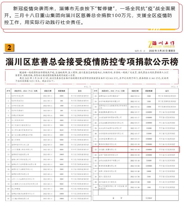 山東重山集團(tuán)捐款100萬元支援淄川疫情防控