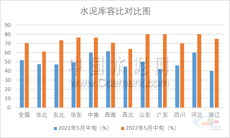 從中國(guó)水泥網(wǎng)·水泥大數(shù)據(jù)統(tǒng)計(jì)情況看,5月20日全國(guó)水泥庫(kù)容比攀升至70.27%,分區(qū)域看,除了華北和西北外,剩余區(qū)域水泥庫(kù)容比均在70%以上,華東和中南甚至超過(guò)75%。從重點(diǎn)省份來(lái)看,情況更加不樂(lè)觀。在筆者選取的山東、廣東、四川等五個(gè)水泥大省中,山東、廣東和河北水泥庫(kù)容比超過(guò)80%,而去年同期這些省份水泥庫(kù)容比均在60%及以下,廣東只有42%。