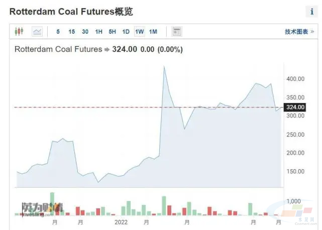 歐洲煤炭價格基準之一、鹿特丹煤炭期貨價格走勢 圖片來源:英為財情