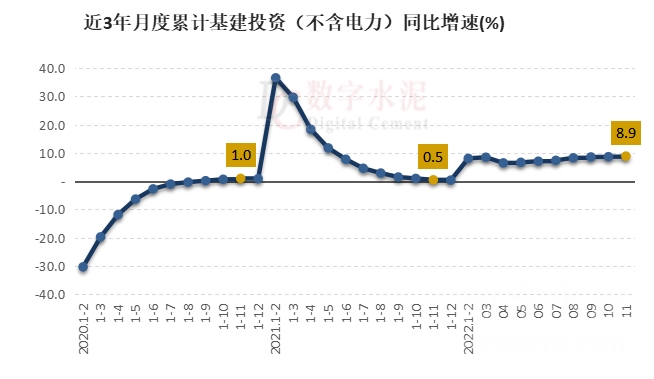 2022年1-11月,全國固定資產(chǎn)投資(不含農(nóng)戶)52萬億元,同比增長5.3%,增速較1-10月下降0.5個百分點,高于去年同期0.1個百分點。從單月投資來看,11月份固定資產(chǎn)投資(不含農(nóng)戶)環(huán)比下降0.87%。