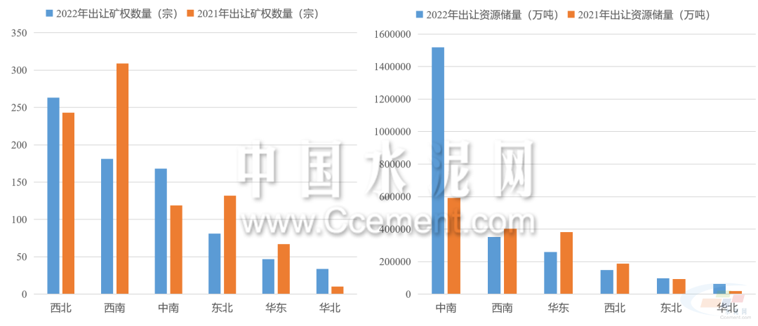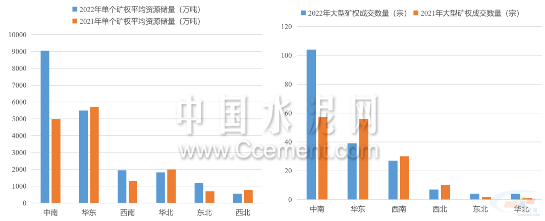 2022年礦權(quán)出讓呈現(xiàn)數(shù)量減少,儲(chǔ)量增長(zhǎng)的特點(diǎn)。據(jù)目前已公布的礦權(quán)成交結(jié)果來看,2022年共有774宗型砂石礦權(quán)成交,同比減少12%,共計(jì)出讓資源儲(chǔ)量243.7億噸,同比增長(zhǎng)超40%。中南地區(qū)是出讓礦權(quán)資源儲(chǔ)量最高的區(qū)域,占全國(guó)出讓資源儲(chǔ)量的六成以上,同比增長(zhǎng)超150%。