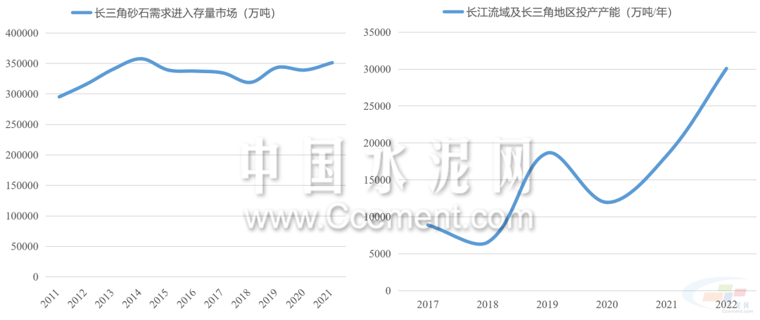 近年來長(zhǎng)江中下游城市的砂石骨料需求趨于平穩(wěn),2015年后江浙滬皖地區(qū)的砂石骨料需求量圍繞34億噸均線上下震蕩,長(zhǎng)三角地區(qū)需求進(jìn)入存量市場(chǎng)。但是,2017年至2022年,除青海西藏外,長(zhǎng)江流域省市(含浙江)每年投放的砂石骨料產(chǎn)能翻了三倍。長(zhǎng)江流域面臨供給過剩危機(jī),長(zhǎng)期價(jià)格或進(jìn)入下行區(qū)間。