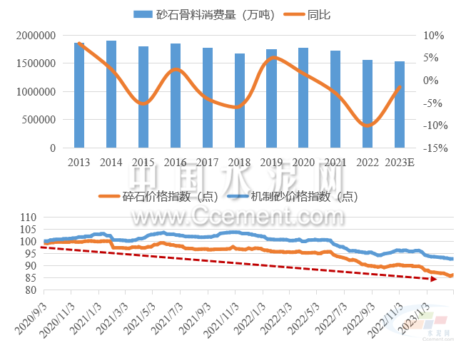 預(yù)計(jì)2023年需求偏穩(wěn)運(yùn)行,二季度后需求或有所反彈。根據(jù)水泥、混凝土的需求預(yù)期,預(yù)計(jì)2023年全國(guó)砂石骨料需求同比偏穩(wěn)運(yùn)行,或有小幅下滑。在供需反向變動(dòng)的預(yù)期下,長(zhǎng)期價(jià)格進(jìn)入下行區(qū)間,預(yù)計(jì)2023年砂石價(jià)格中樞仍將小幅下移。