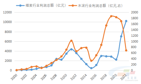 2000年,煤炭行業(yè)和水泥行業(yè)均剛剛實現扭虧為盈,煤炭行業(yè)實現利潤總額0.5億元,水泥行業(yè)實現利潤總額6.33億元,水泥行業(yè)利潤總額是煤炭行業(yè)的12.7倍。22年后,煤炭行業(yè)利潤總額已是水泥行業(yè)的14.9倍,令水泥行業(yè)望塵莫及。