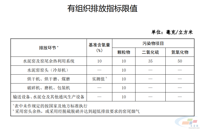 征求意見(jiàn)稿提到了有組織排放指標(biāo)要求,在基準(zhǔn)含氧量10%的條件下,水泥窯及窯尾余熱利用系統(tǒng)煙氣顆粒物、二氧化硫、氮氧化物排放濃度小時(shí)均值分別不高于10、35、50mg/m3。達(dá)到超低排放的水泥企業(yè)每月生產(chǎn)時(shí)間至少95%以上時(shí)段小時(shí)均值排放濃度滿(mǎn)足上述要求。