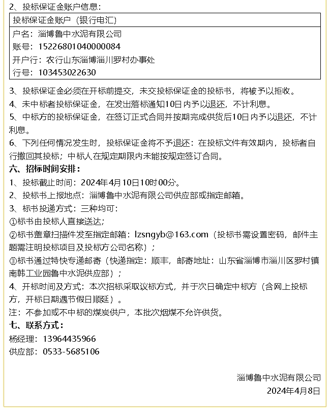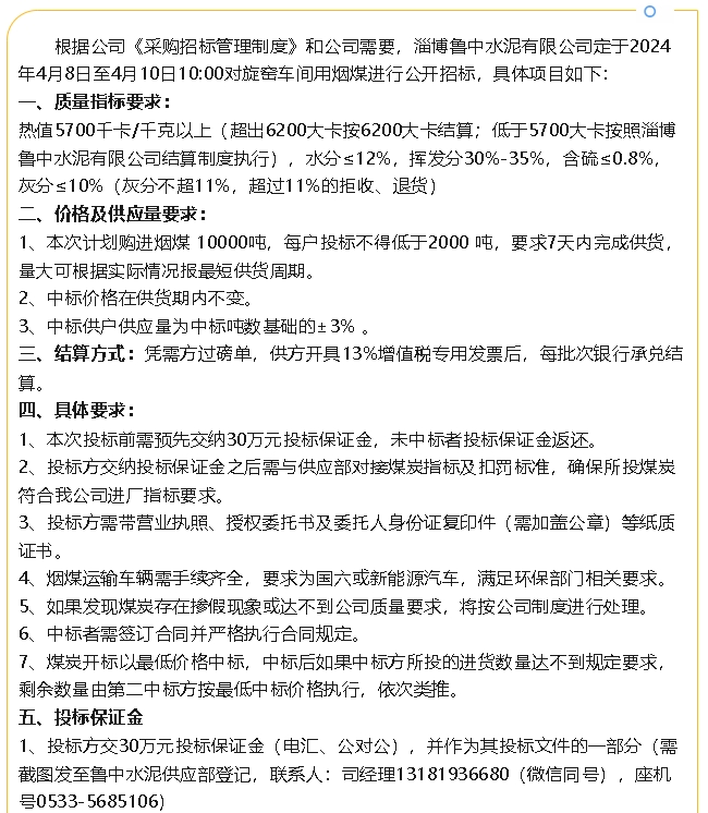 【招標公告】魯中水泥