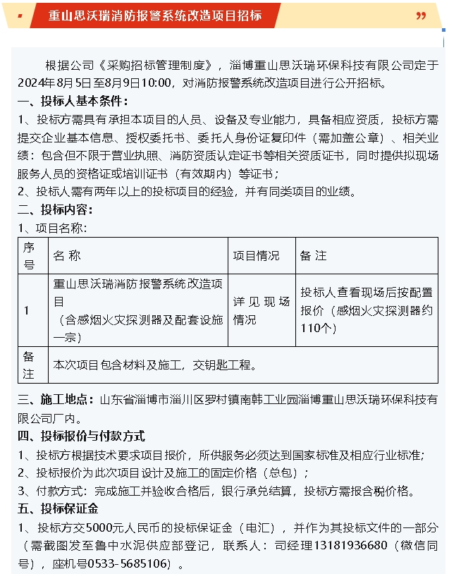 【招標公告】魯中水泥煙煤、重山思沃瑞消防報警系統(tǒng)改造項目招標