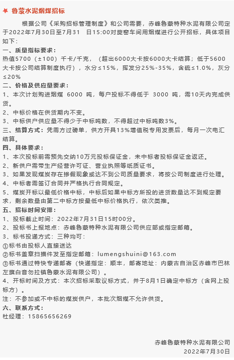 【招標公告】魯蒙水泥煙煤,黃驊三陽球破磨機襯板、袋裝水泥編織袋,鵬峰化工鋼材招標