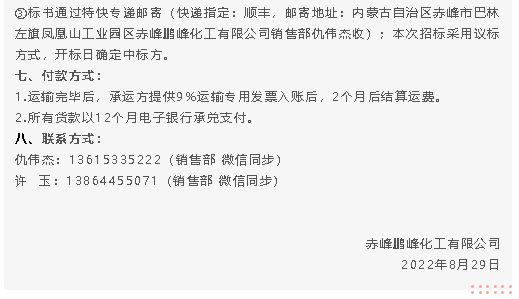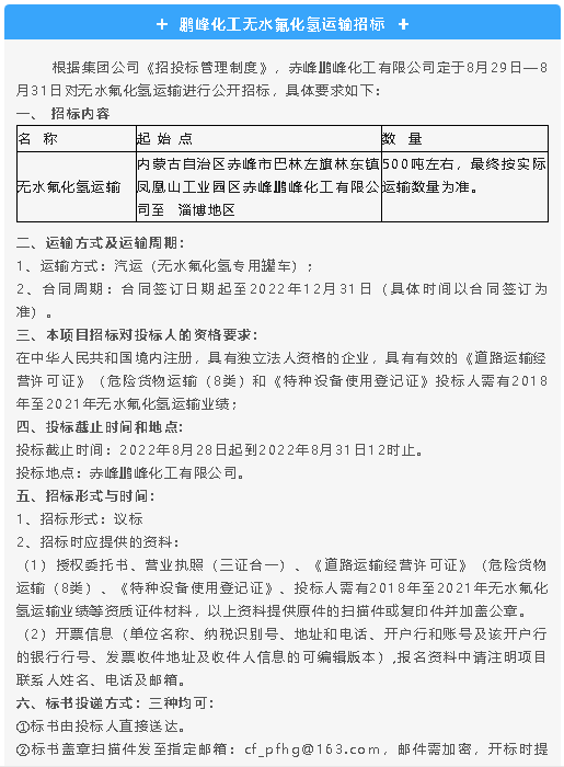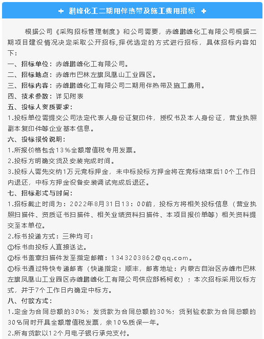【招標(biāo)公告】鵬峰化工無水氟化氫運(yùn)輸、二期用伴熱帶及施工費(fèi)用招標(biāo)
