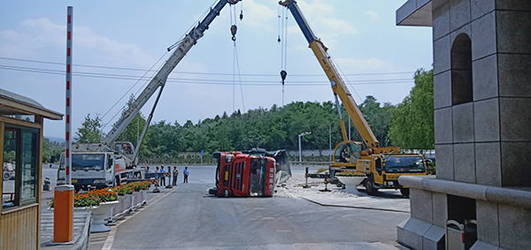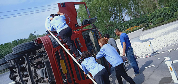 6月22日,正值大家正常工作的時間,一聲巨響打破了工作的寧靜。102省道由東往西的一輛河北籍重型卡車為躲避突然掉頭的車輛向公司正門西側(cè)猛沖過來,緊急的剎車讓車輛瞬間傾翻在地,滿載的數(shù)十噸石灰灑落一地。集團總務(wù)處主任王宏得知消息立即向前查看詳情,側(cè)翻造成了駕駛室嚴重變形,貨車司機被困其中,無法動彈,傷勢不明。安保隊員陳萬鵬在第一時間撥打了120救助電話。怎樣把受傷人員從側(cè)翻變形的駕駛室中迅速救出來成了首先解決的難題。側(cè)翻的駕駛室目測有兩米高,需要搭梯才能進入朝天的車門,時間不等人,早一分鐘救出傷員,他們的生命就少一份危險,安保人員用被撞壞的欄桿代替腳梯,由兩名值班門衛(wèi)扶著欄桿,陳萬鵬爬梯救人。頂著烈日,他不懼困難、奮力施救,汗水一滴一滴從頭上落下,侵透了衣衫,他顧不上抹去刺痛眼睛的汗水,心里只想著盡快把傷員救出。因為貨車司機體型偏胖,又被方向盤牢牢的卡住,為了避免貨車司機受到二次傷害,只能利用現(xiàn)有的空間慢慢把傷員往上拖,經(jīng)過半個多小時的時間終于把貨車司機順利救出,120醫(yī)護人員立即將他送往醫(yī)院進行救助。隨后,王宏、王立群協(xié)調(diào)粉磨車間的宋濤、供料車間的王新剛等單位領(lǐng)導分別帶領(lǐng)部分職工和兩臺裝載車在現(xiàn)場待命,救出傷員后清理現(xiàn)場;協(xié)調(diào)的兩臺吊車待傷員救助后將側(cè)翻貨車吊起扶正,同時安保人員疏導現(xiàn)場交通,確保102省道和公司正門的交通安全。下午1:30左右,灑落的石灰清理完畢、側(cè)翻的貨車成功吊起扶正。救援結(jié)束后正值午時,王宏安排兩名駕駛員到職工食堂就餐,細致入微的照顧讓兩名駕駛員感動不已。身在異鄉(xiāng)的謀生者感到了如親人般的溫暖,他們激動的握著王宏的雙手,表示真心的感謝。不善言談的貨車司機在晚上給王宏發(fā)了微信紅包,并對重山集團的這次義務(wù)救援表示深深的感謝,王宏婉言謝絕了他的好意,向他表示:我們重山人做事都要對得起自己的良知,不求任何回報的。這是我們應(yīng)該做的。用實際行動詮釋了致良知思想的內(nèi)涵和意義,充分體現(xiàn)了重山集團的社會擔當和致力構(gòu)建和諧社會的決心。